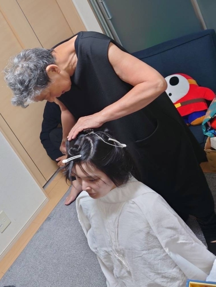 いつもの仕事着で楽屋にて髪結い中