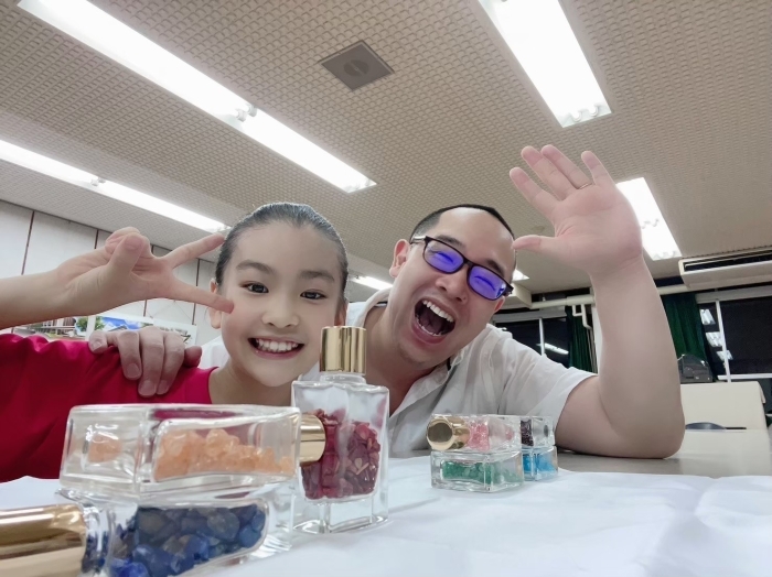 天然石が詰まったカラーボトルを使って、対面式のカラーカウンセリングを行っています。